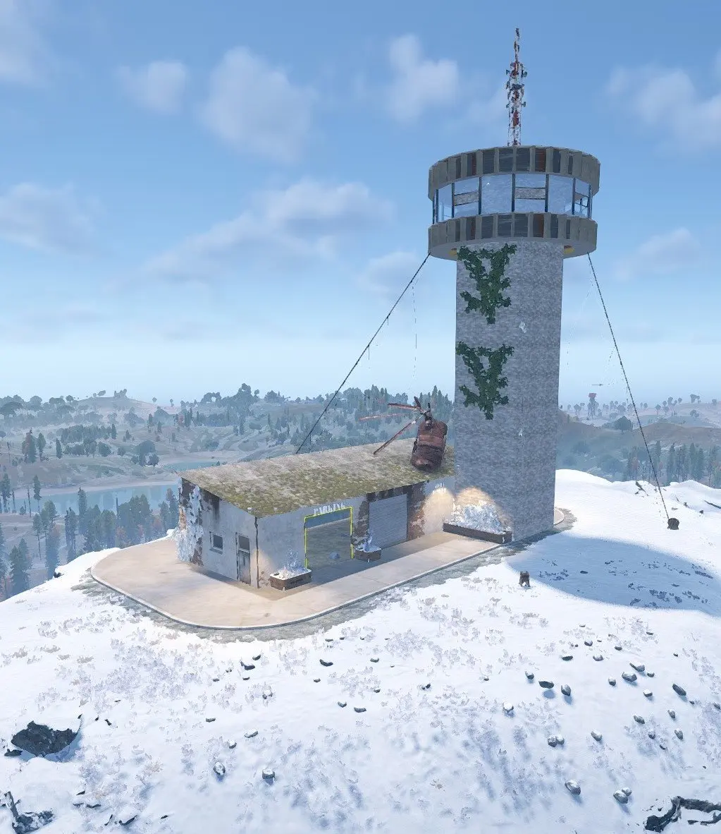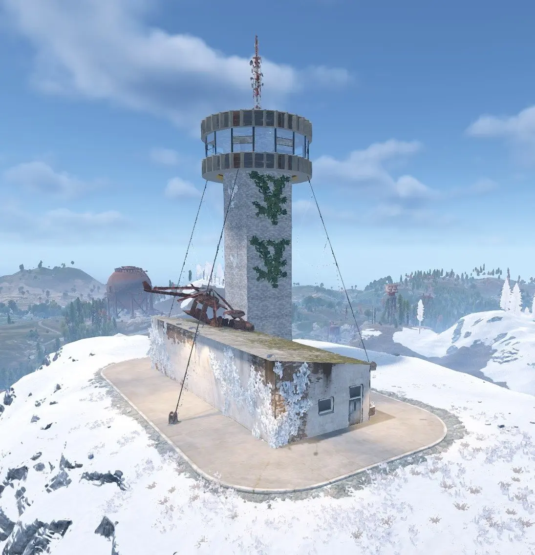 A performance-friendly heli tower prefab with a 360° tower view and a fully equipped utility building, designed for fast respawns and engaging the Patrol Helicopter.