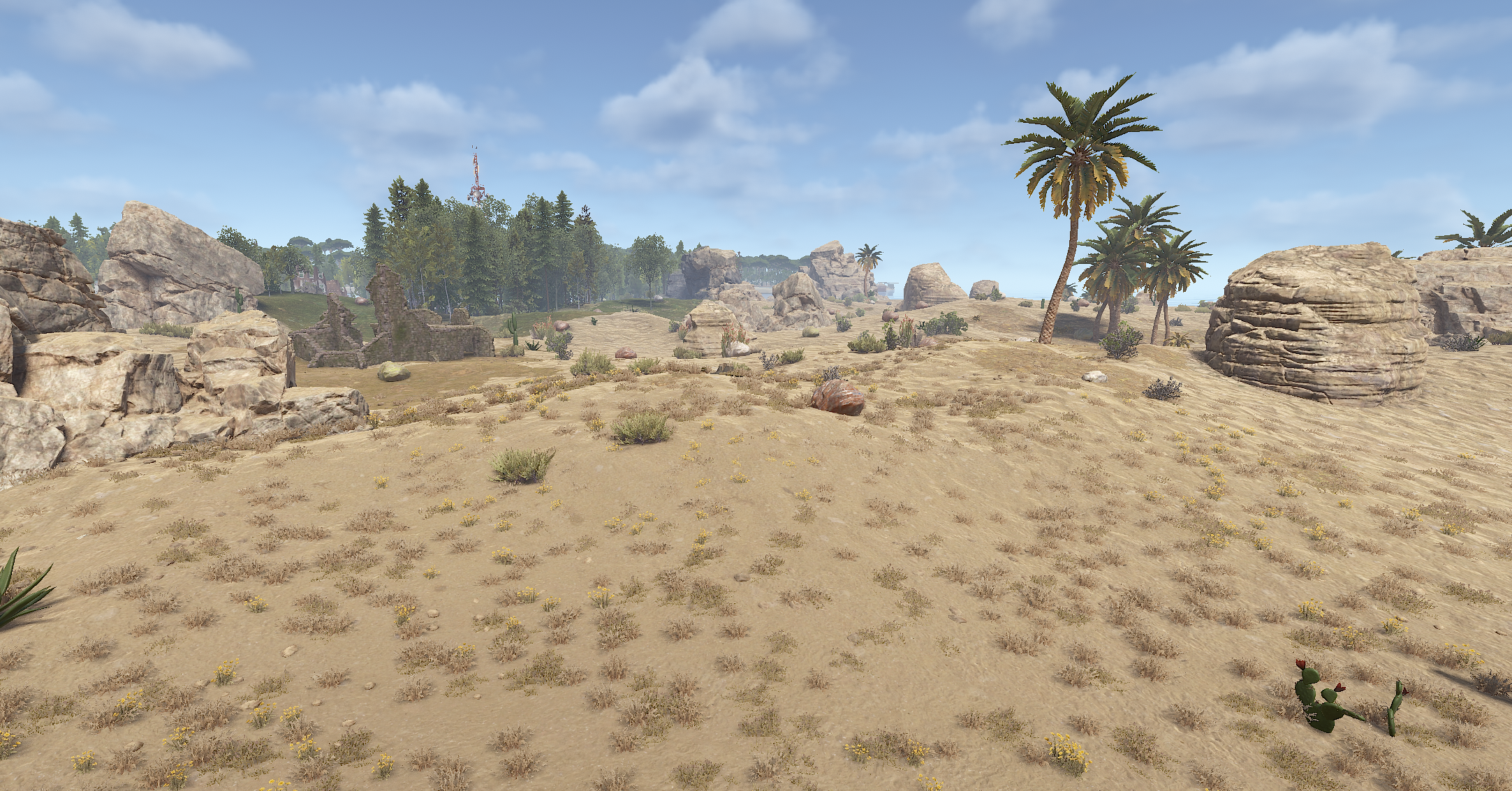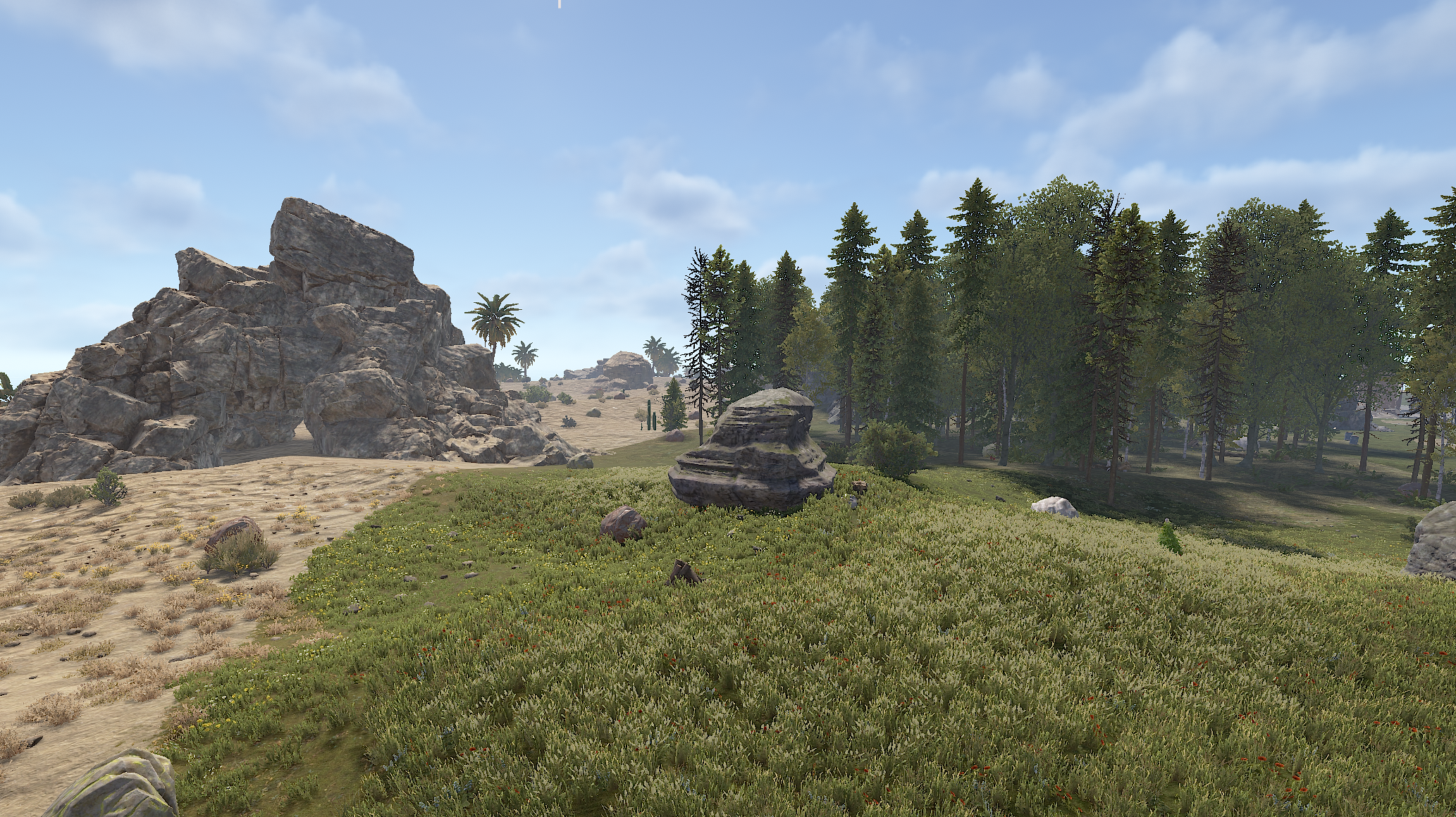 • Custom Terrain & Biomes: Explore a custom-sculpted environment featuring two distinct geographical areas: arid and temperate biomes. The terrain is complemented by realistic rock formations and patches of forest.