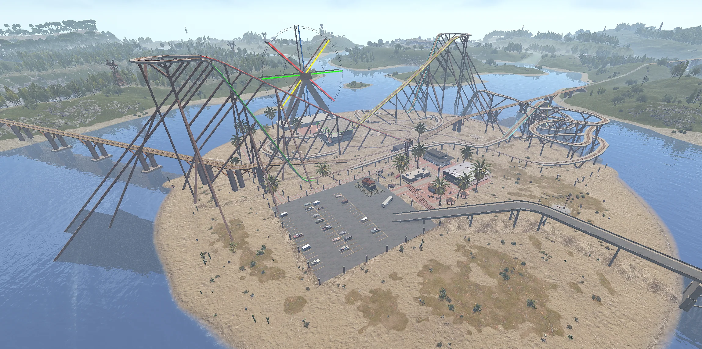 The crown jewel of the island. This isn't just a static monument—it features a fully functional, custom-coded rollercoaster. Scale the heights for a view of the island before diving into the chaos below.